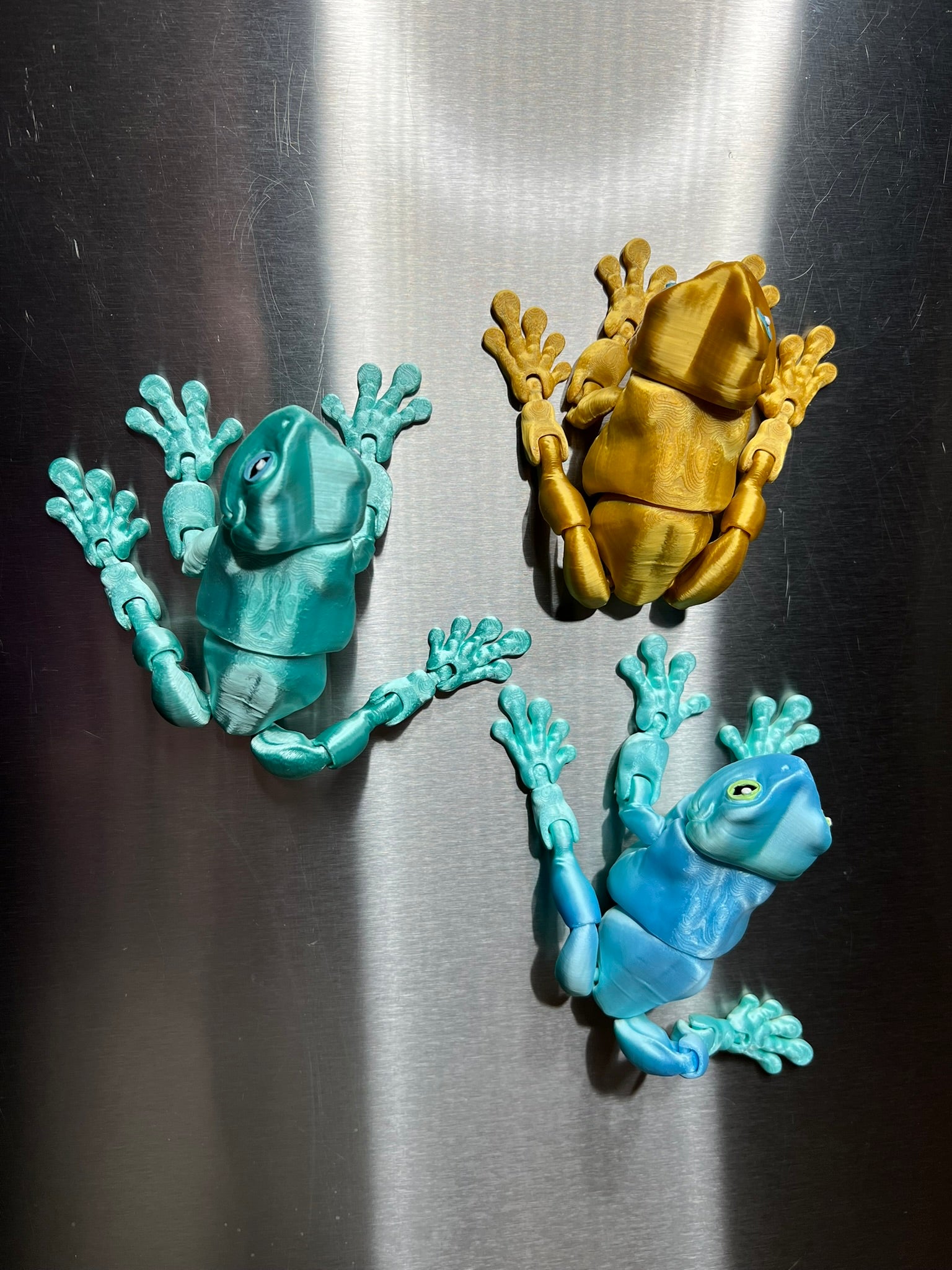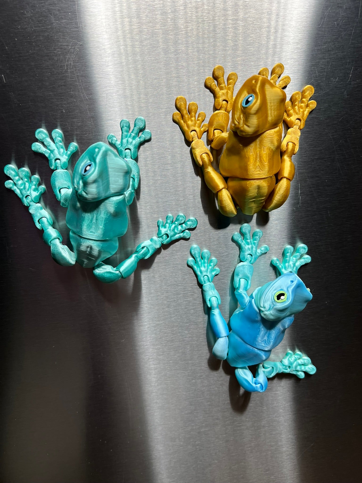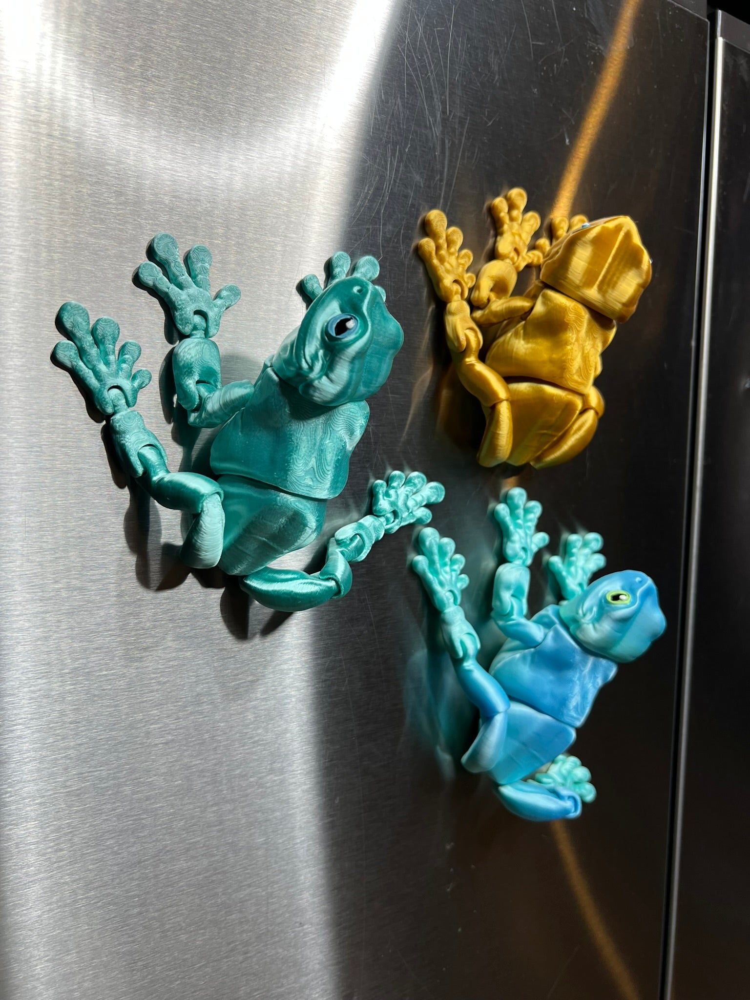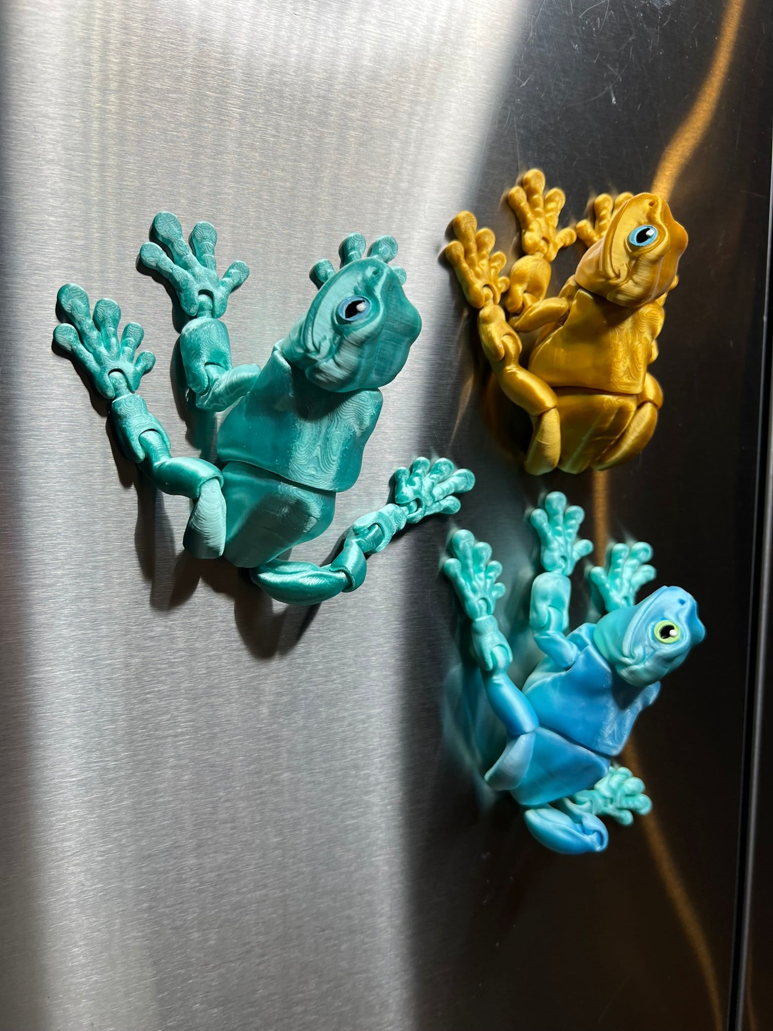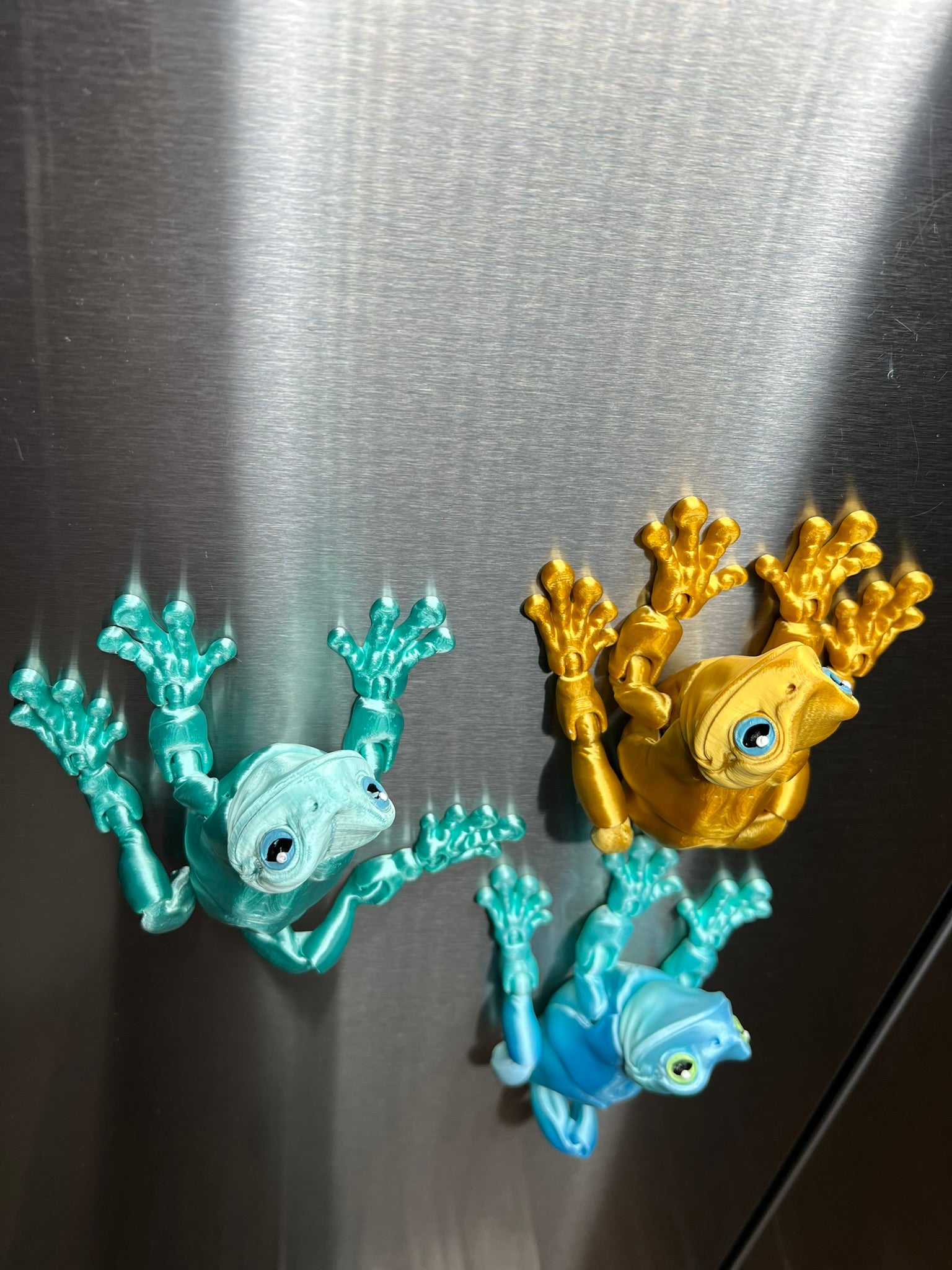 These playful magnetic frogs are ready to hop onto your fridge, filing cabinet, or any metal surface! Each one is 3D printed with poseable limbs, strong magnets in their feet, and those signature big, expressive eyes—hand-painted to give every frog its own personality. Available in a variety of vibrant colors, these little climbers add a splash of charm and fun wherever they stick!