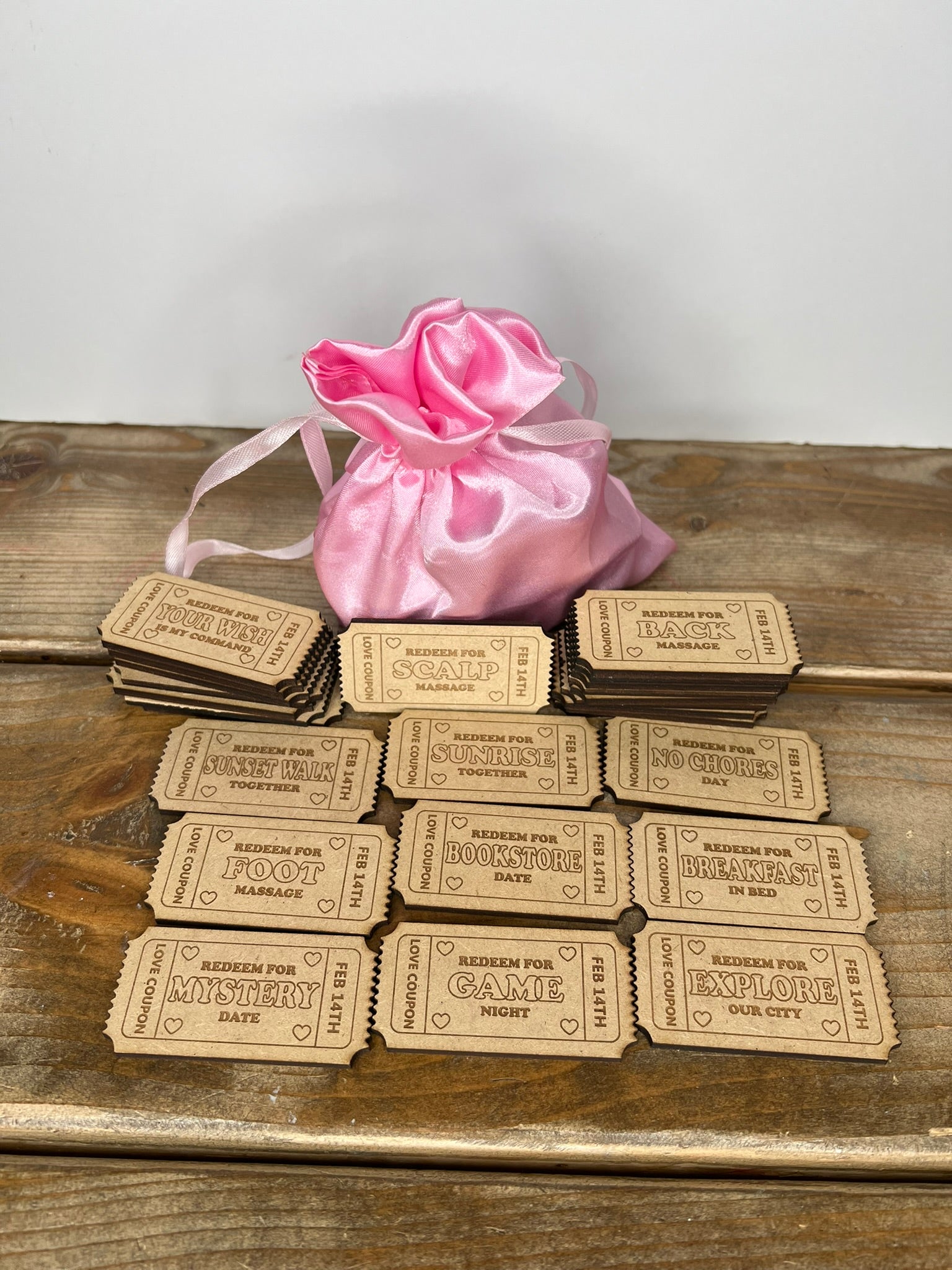 Includes 50 reusable love coupons filled with thoughtful, romantic prompts—mostly sweet with a few playful, lightly spicy options. Comes in the cutest pink silk drawstring bag, perfect for gifting or keeping as a keepsake.